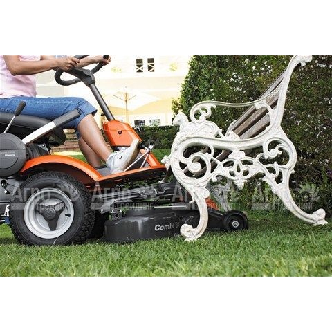 Гидростатическая система полного привода (AWD) обеспечивает автоматическую регулировку тяги на четыре колеса, что способствует машине передвигаться одинаково хорошо по участку с рельефной поверхностью. Управление трансмиссией педальное. Все органы управления находятся в непосредственной близости от пользователя. В стандартной комплектации не предусмотрена режущая дека. На райдер можно устанавливать деки Combi, работающие в двух режимах - мульчирование и скашивание с боковым выбросом, и имеющие разную рабочую ширину скашивания. Режущая дека обеспечивает должное качество стрижки газона благодаря своей доступности к любому уголку участка. Автоматическое включение режущего инструмента при опускании деки.